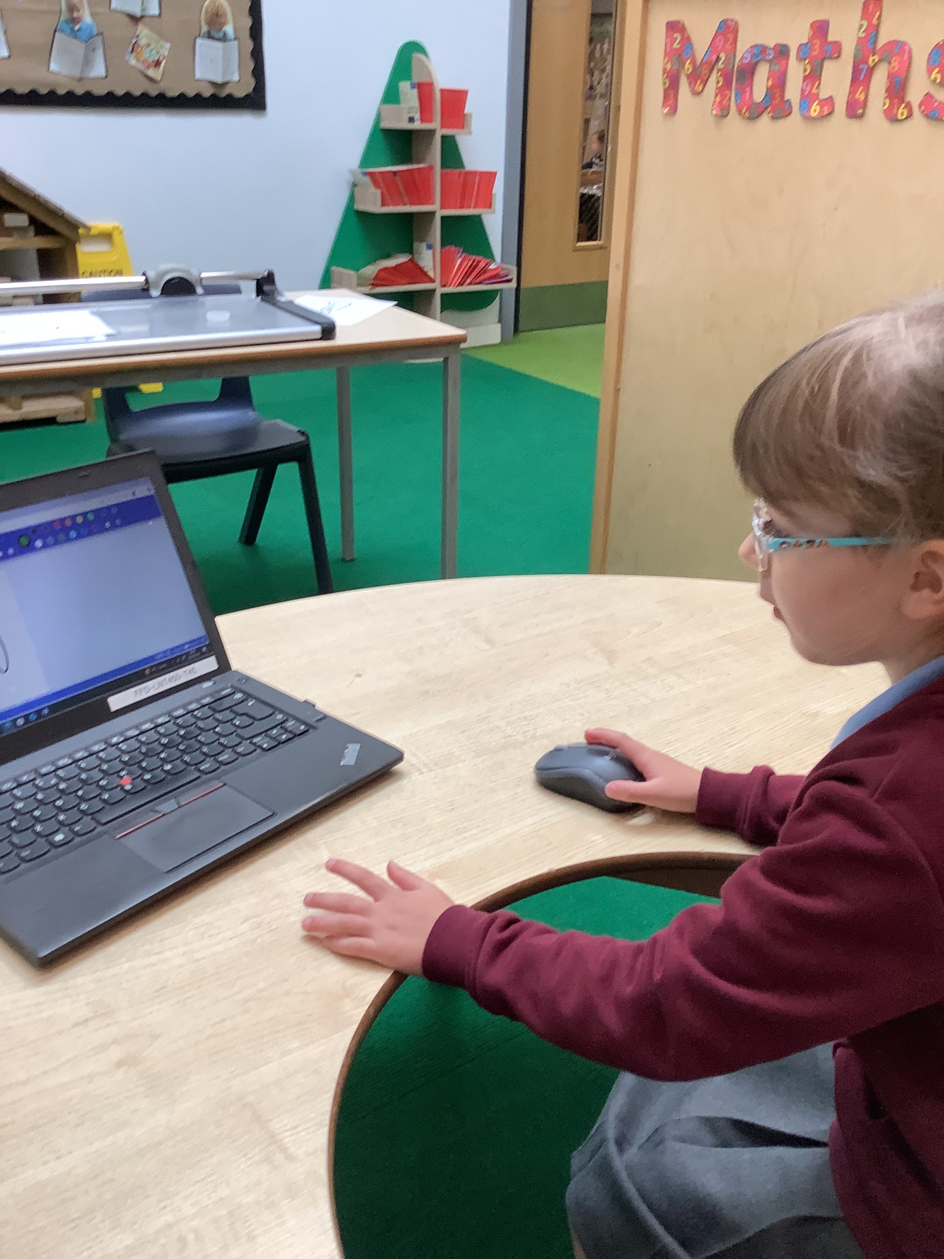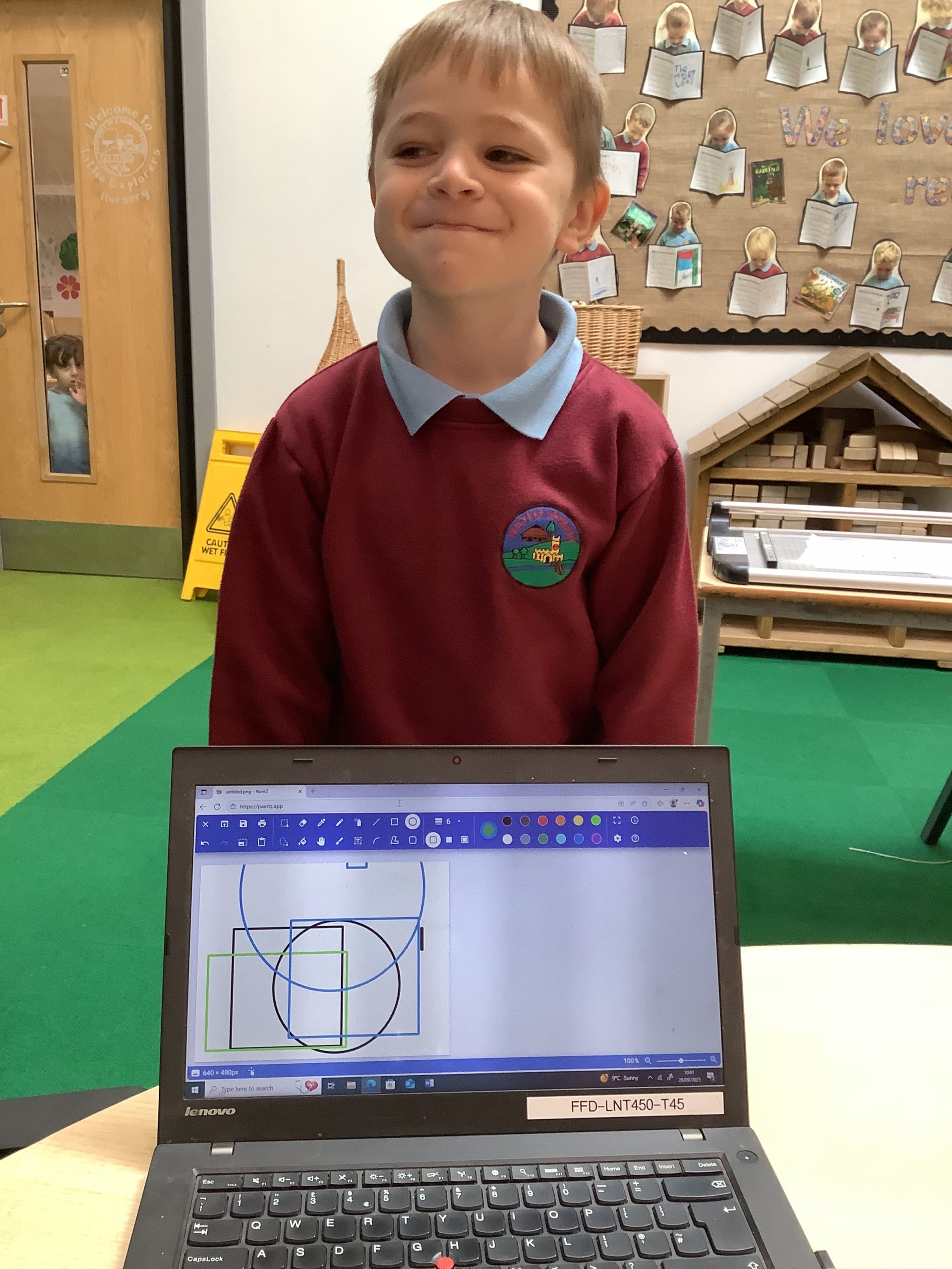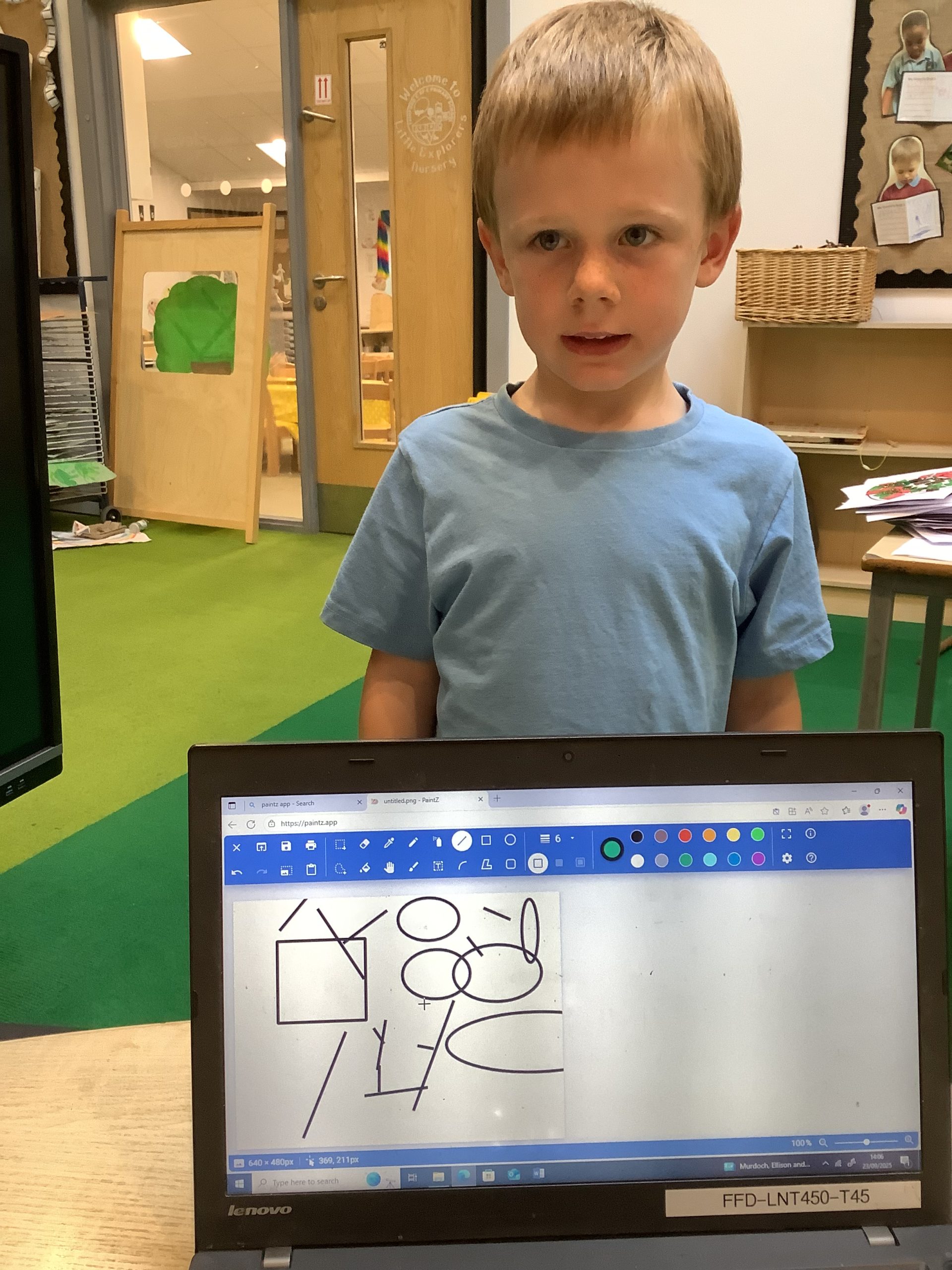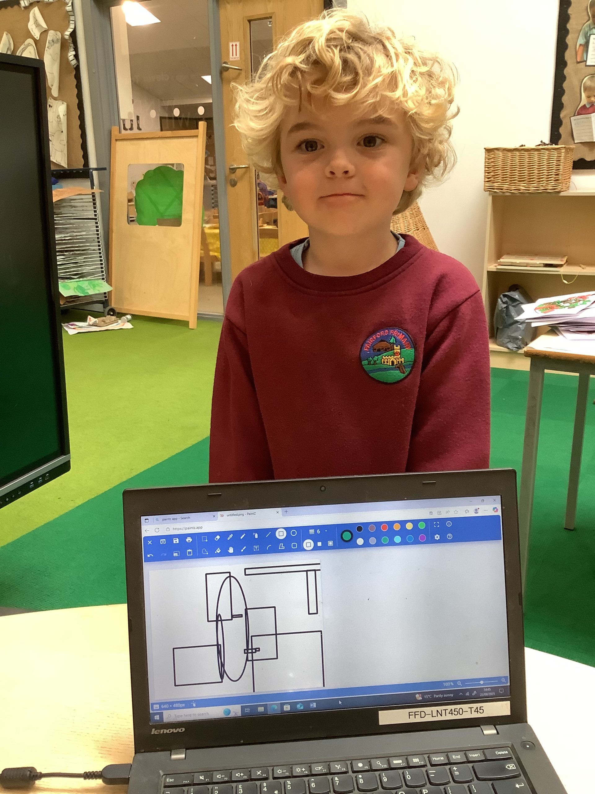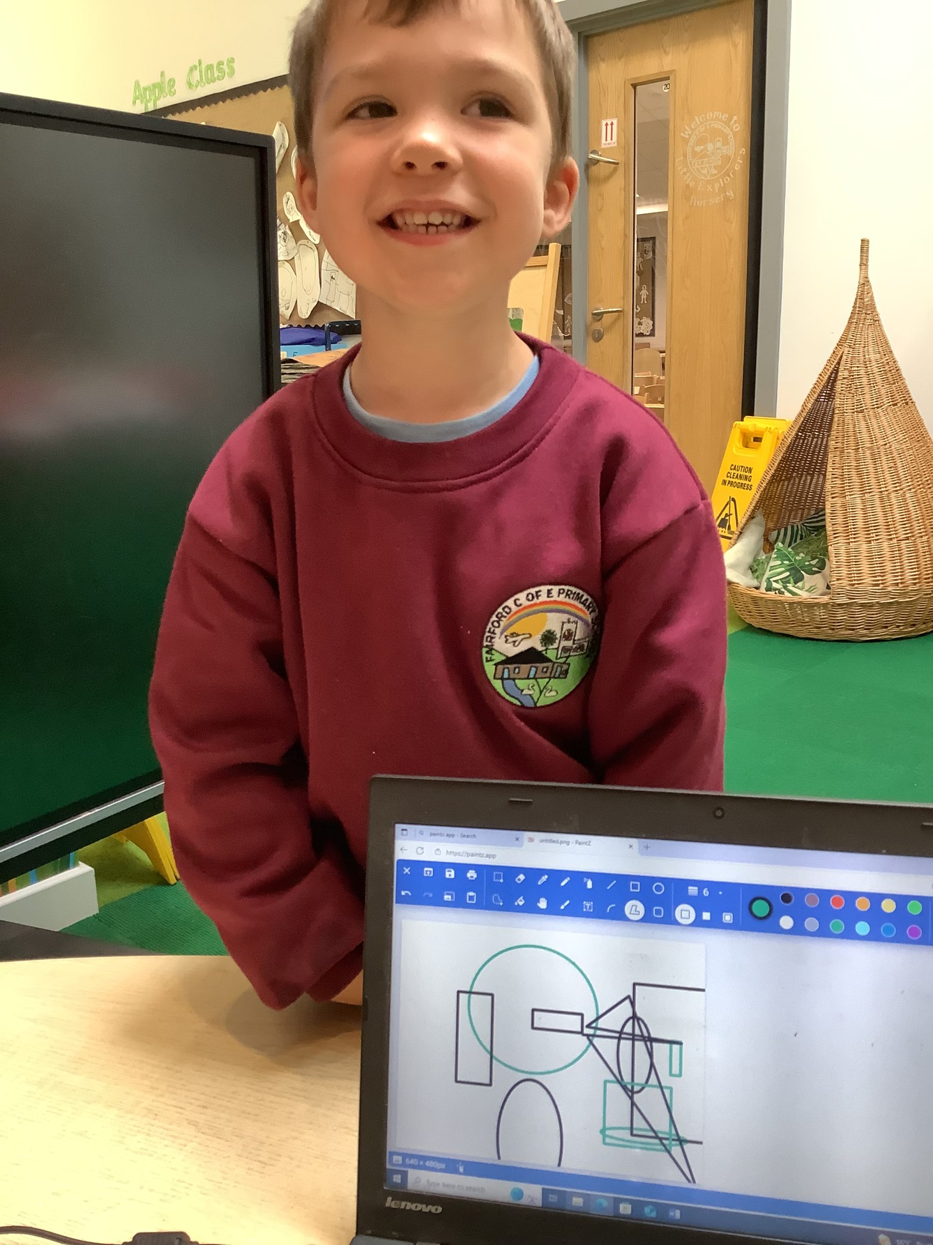 Cherry Class typed their names onto a laptop using a keyboard and used a mouse to create a shape picture in ‘paint’.