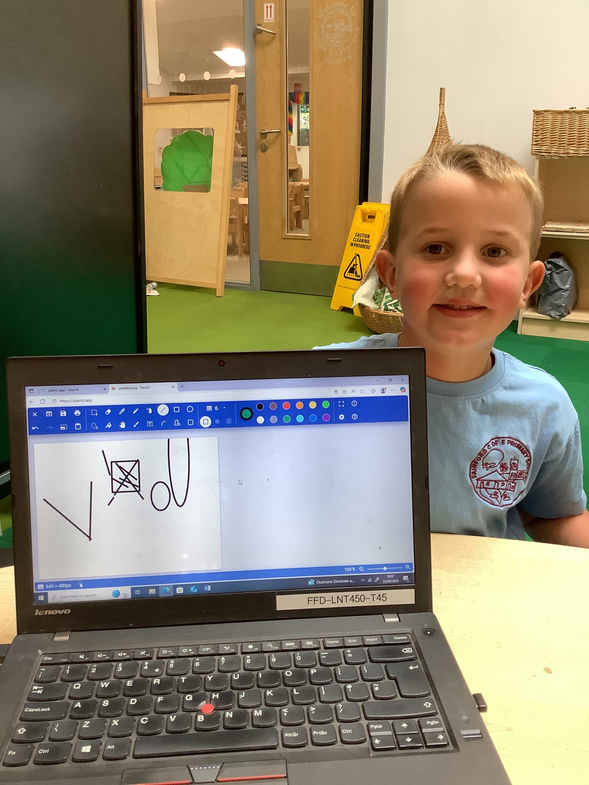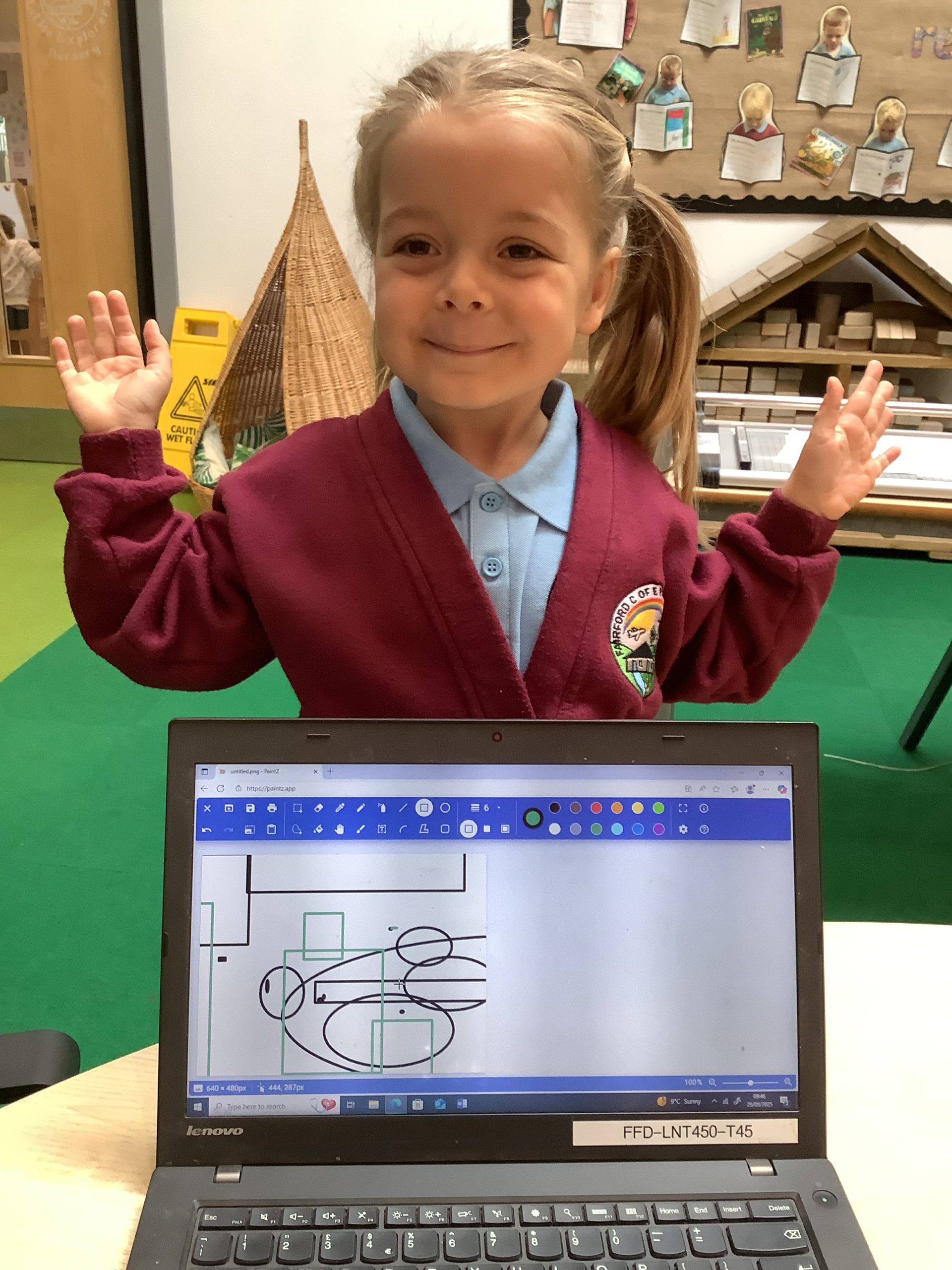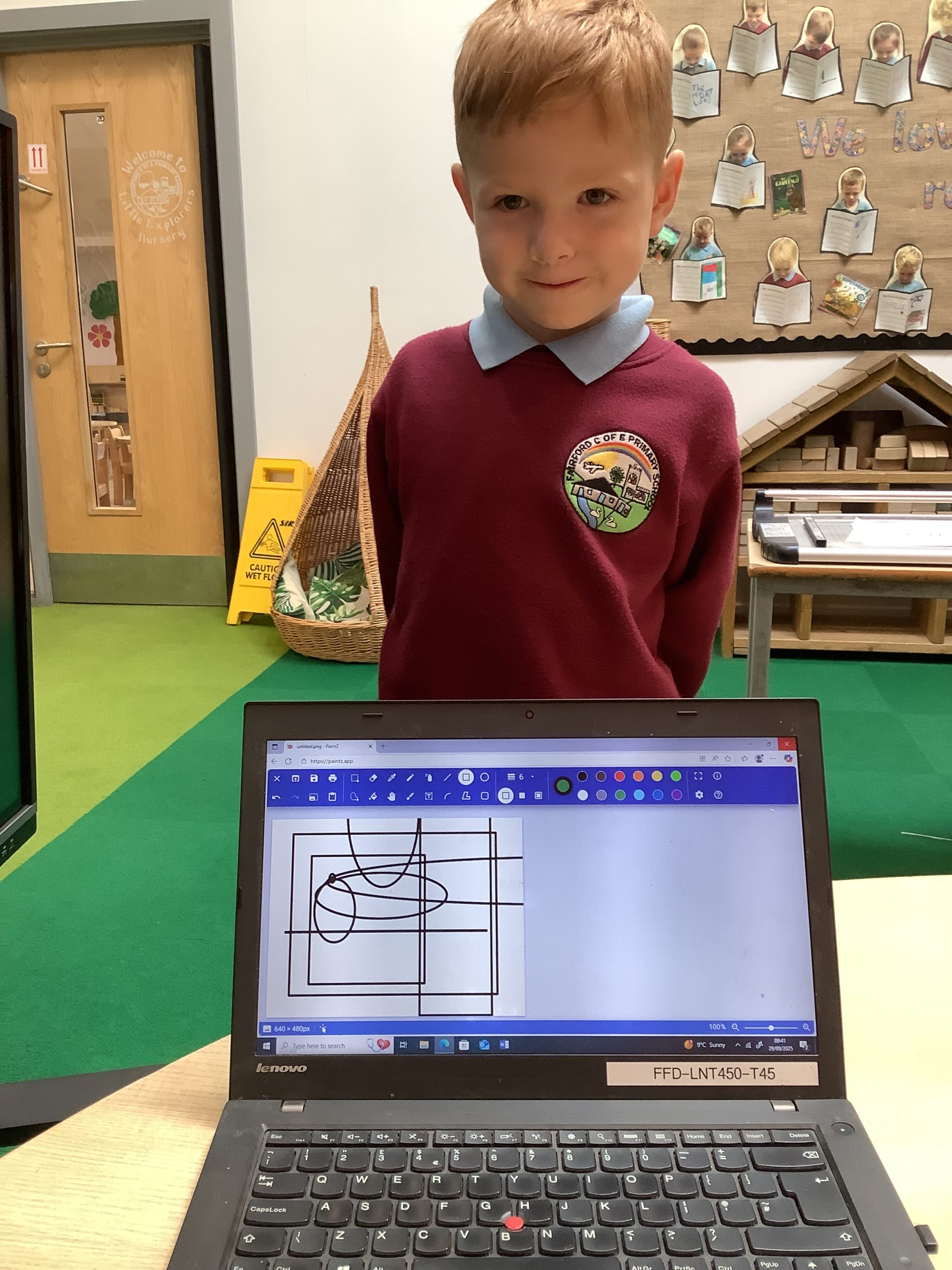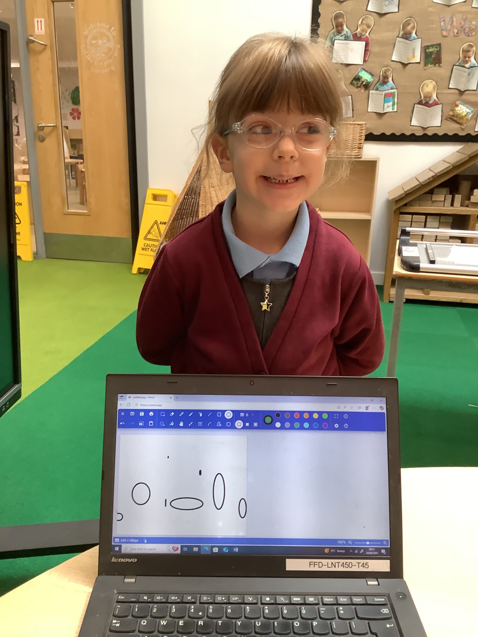 Cherry Class typed their names onto a laptop using a keyboard and used a mouse to create a shape picture in ‘paint’.